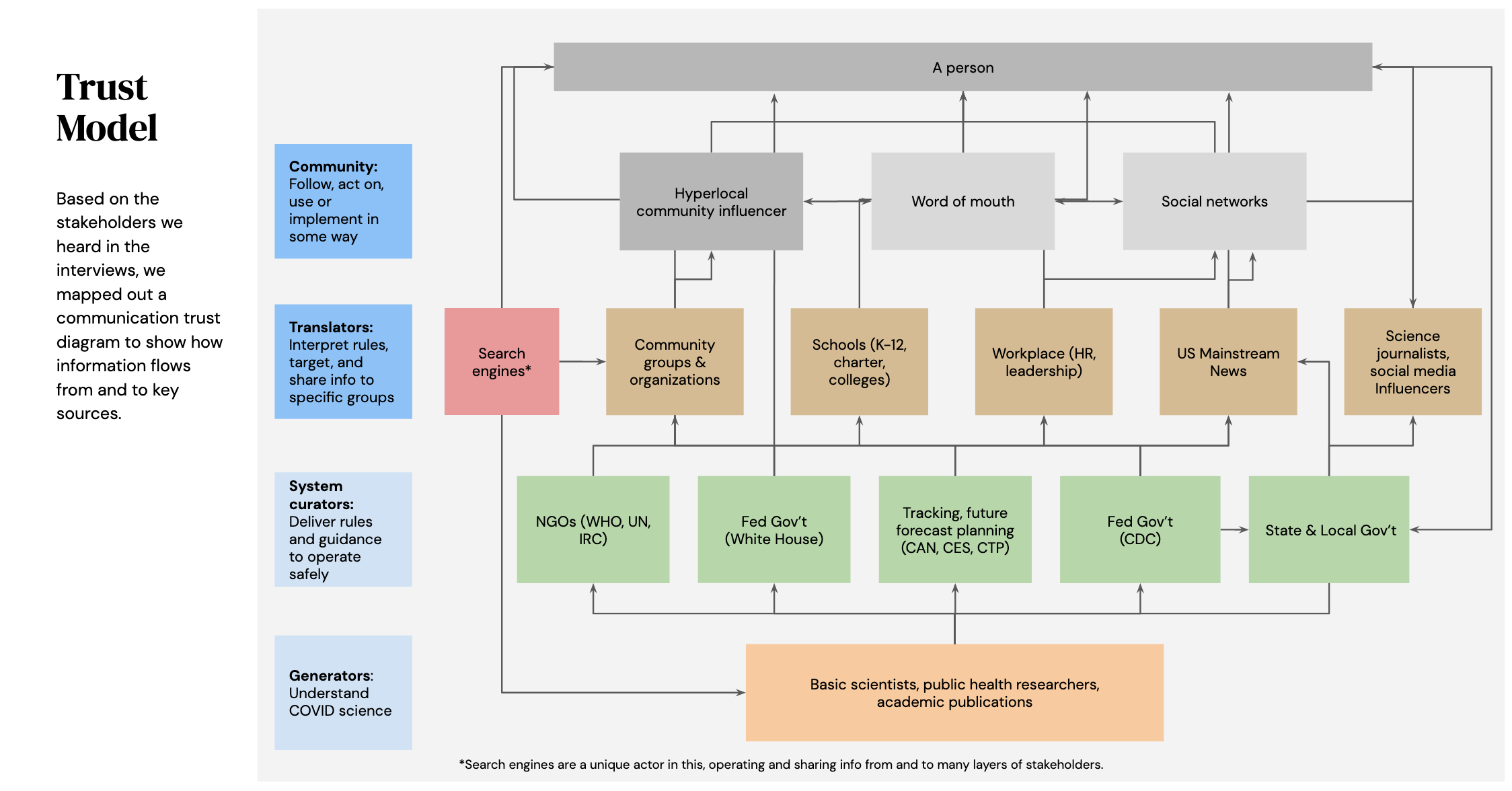 This is where the “translators”, the focus of the second sprint, appeared in the first sprint of research. Americans are more likely to trust leaders in their communities than government sources, and 85% of participants we spoke with in the first round of research cited at least one type of translator as a primary source of COVID information.