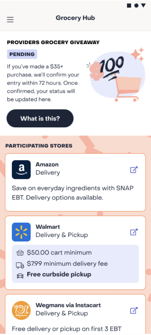 This was the first time a giveaway like this would live in the Providers app and there were a number of technical limitations that prevented us from designing the most optimal user experience. Given the specific program rules around using EBT for online grocery purchasing, we hypothesized that the specific entry rules, purchasing a certain amount with an EBT card online, would cause the most confusion.